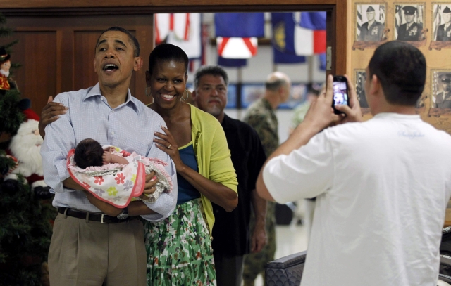 Όμως επειδή ένας πρόεδρος δεν εφησυχάζει ποτέ και το πρόγραμμά του είναι πάντα γεμάτο υποχρεώσεις, έπρεπε να επισκεφτεί τους πεζοναύτες που υπηρετούν στη βάση της Χαβάης. Πήγε λοιπόν και φωτογραφήθηκε μαζί τους.